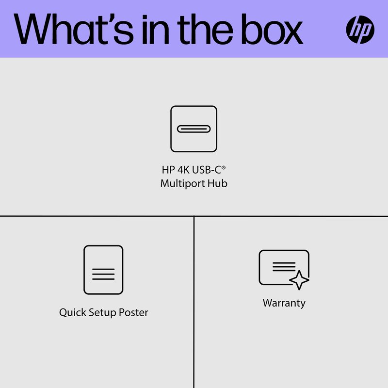 HP 4K USB-C Multiport Hub 65W - 1 x USB-C doubles as Displayport 1.4 (4K UHD 60Hz display support), 2 x USB-C, 1x USB-C(65W)