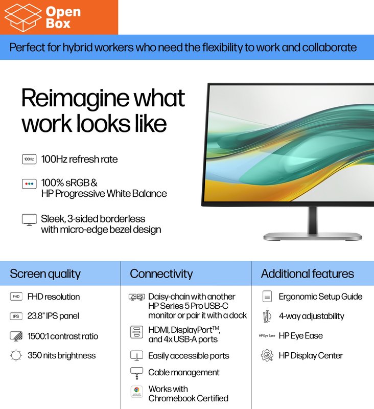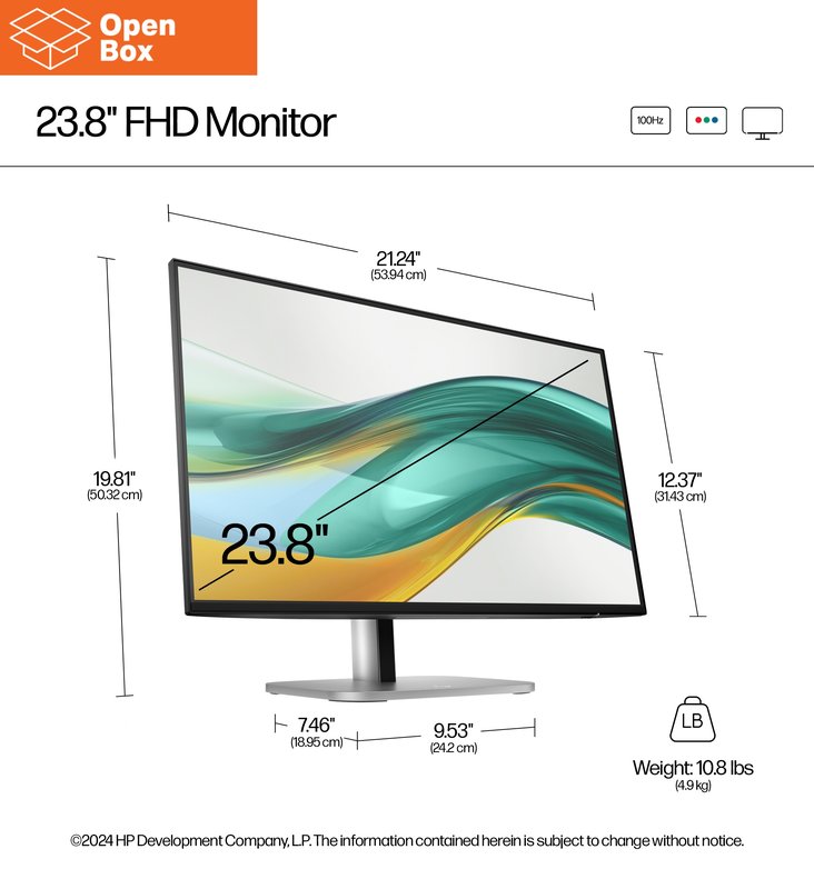 - Get more done on this 23.8" FHD resolution monitor with 100 Hz refresh rate[1]. Experience vibrant, consistent colors with 100% sRGB[1] and HP Progressive White Balance.[2]