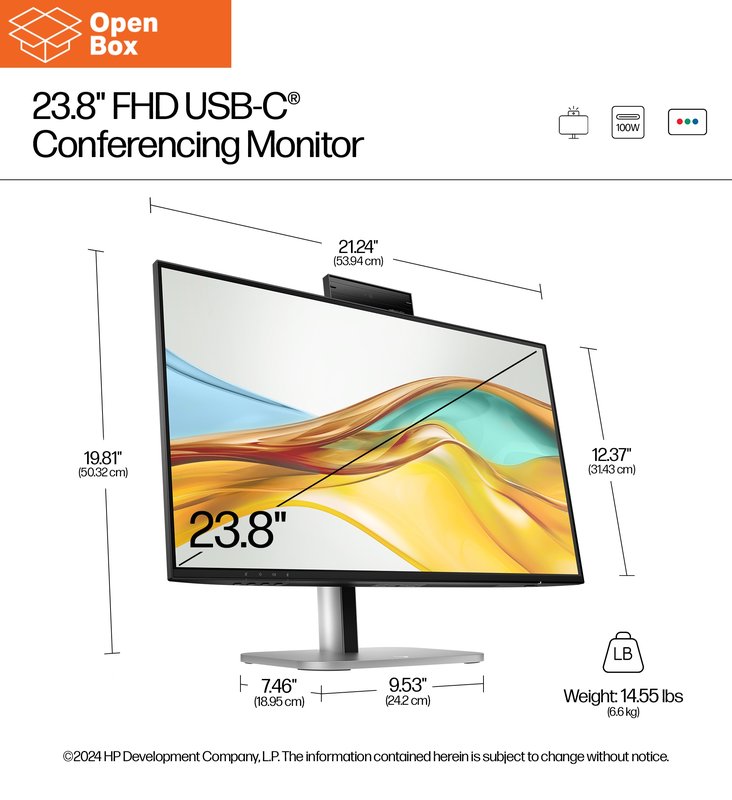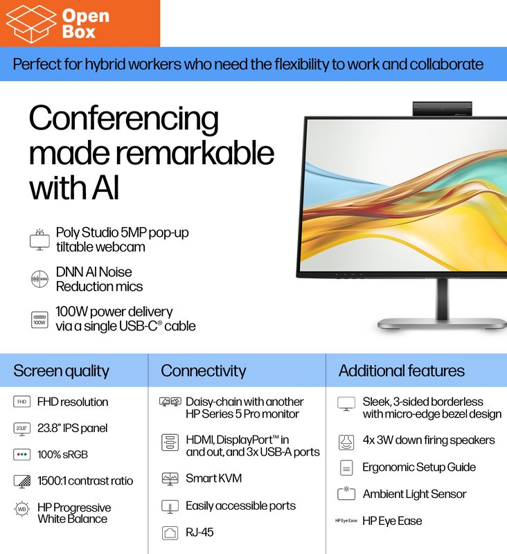 HP 524pm Series 5 Pro FHD Conferencing Monitor - OPENBOX - 23.8" 1920x1080 FHD 350-nit 100Hz AG, IPS, USB-C(100W/15W)/HDMI/DP Daisy-Chain, 3x USB-A, speakers, webcam, RJ-45 LAN, height adjust/tilt/swivel/pivot, 3 years (replaces E24m)