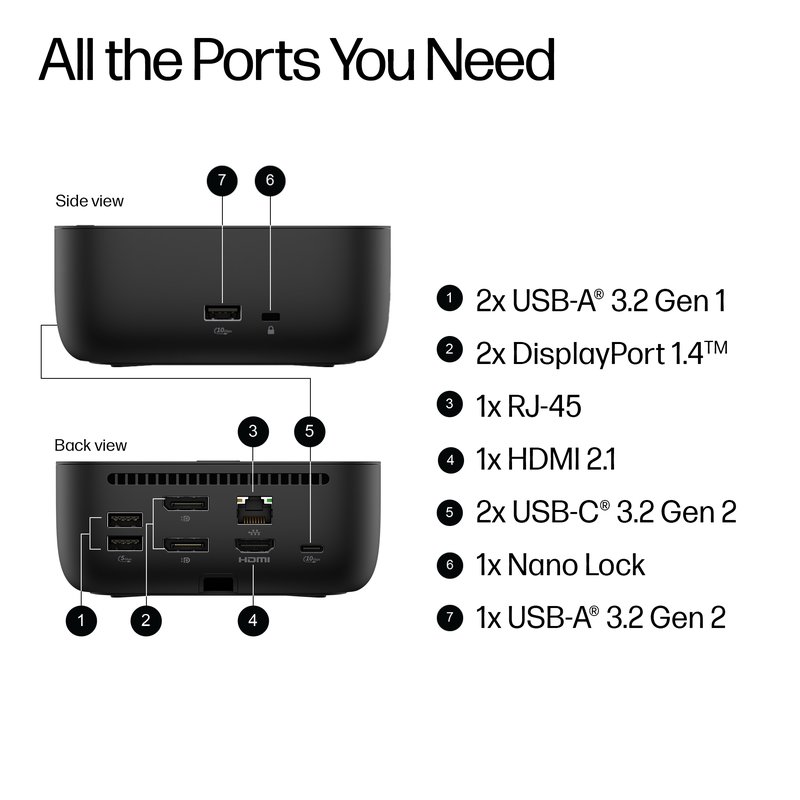 HP USB-C Dock G5 100W - 4x USB 3.0, 1x USB-C(15W), 2x DisplayPort 1.4, 1x HDMI 2.0, 1x RJ-45, 1x combo audio jack