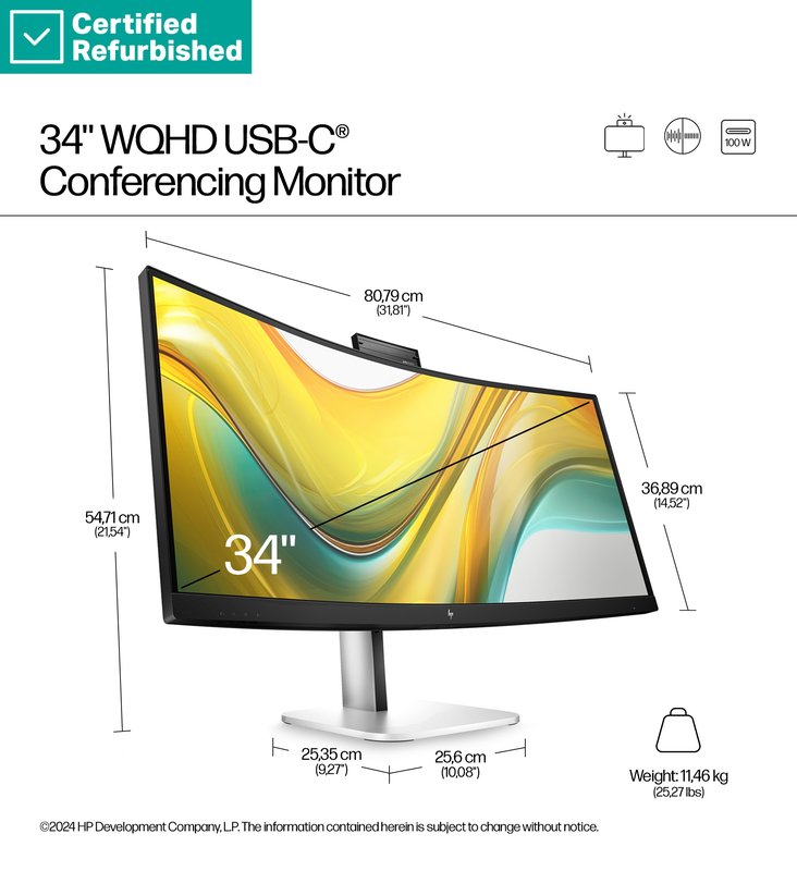 RENEW GOLD HP 534pm Series 5 Pro Curved Conferencing Monitor - 34" 3440x1440 WQHD 400-nit 100Hz AG, Curved, VA, USB-C(100W)/USB-C(15W)/HDMI/DisplayPort, 3x USB-A, speakers, 5MP webcam, RJ-45 LAN, height adjustable/tilt/swivel, 1 years