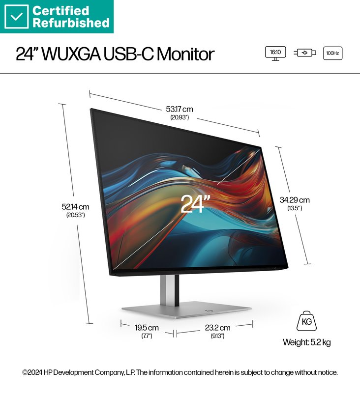 RENEW GOLD HP 724pu Series 7 Pro WUXGA Charging Monitor - 24" 1920x1200 WUXGA 350-nit 100Hz AG, IPS, USB-C(100W)/HDMI/DisplayPort Daisy-Chain, 4x USB-A, RJ-45 LAN, height adjustable/tilt/swivel/pivot, 1 years (replaces Z24u G3)