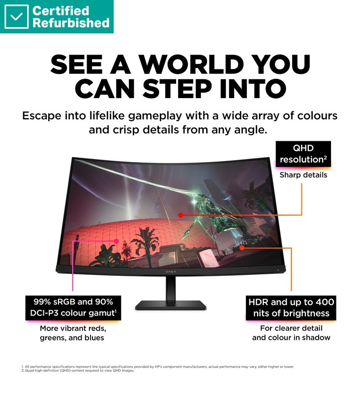 RENEW GOLD OMEN by HP 32c Curved Gaming Monitor - 31.5" 2560x1440 QHD 400-nit 165Hz AG, Curved, VA HDR 400, 2x HDMI/DisplayPort, height adjustable/tilt, 1 years